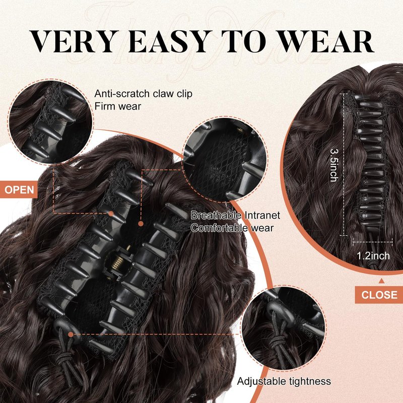 Flufymooz Ponytail Extension, 12" Short Claw Ponytail Extension Wavy Curly Jaw Clip in Pony tails Hair Extension Natural Synthetic Hairpiece for Women (Dark Chocolate Brown)