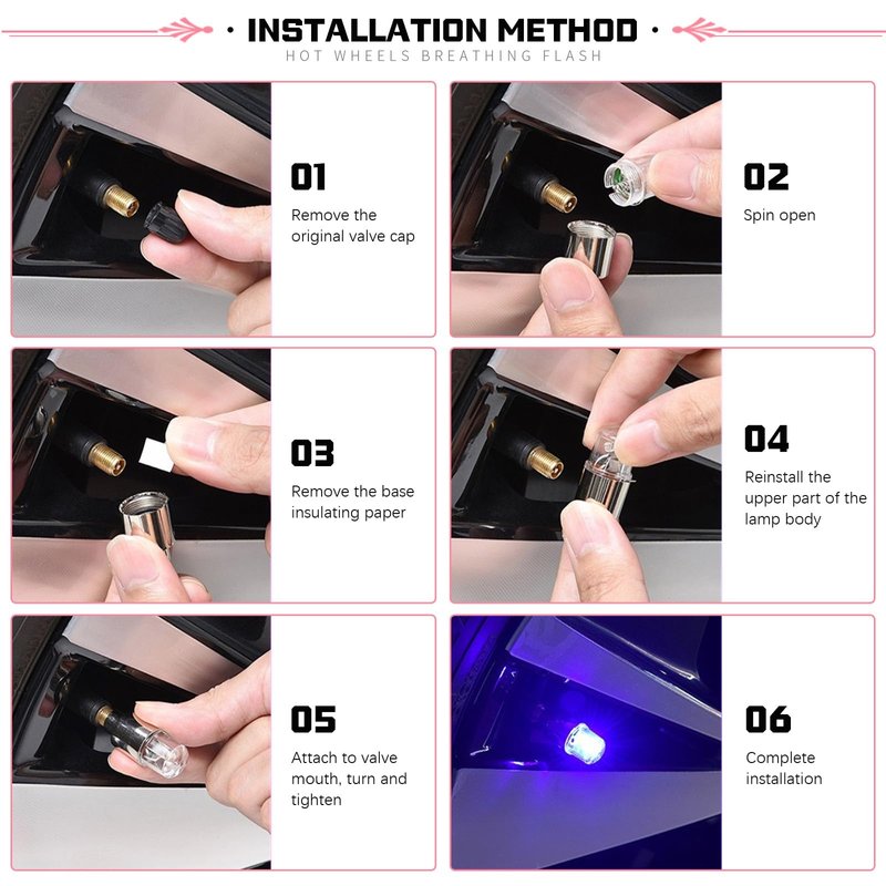 - Universal Accessories: Package includes 6 x valve cover lights to meet your usage needs and provide two in case of errors. Suitable for most cars, motorcycles, bicycles, scooters, etc. Suitable for American valves and British valves. To use, just unscrew the lamp and detach the insulation piece in the middle. Then screw it onto the tire valve stem and tighten.