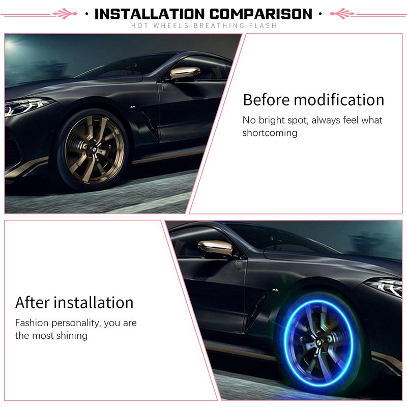 - Cool Modification: This tire valve cap decorative light will form a luminous ring as the tire rotates while the car is driving. The stunning luminous effect has high return rate of the crowd. Bring you the ultimate driving experience and enhance driving pleasure.