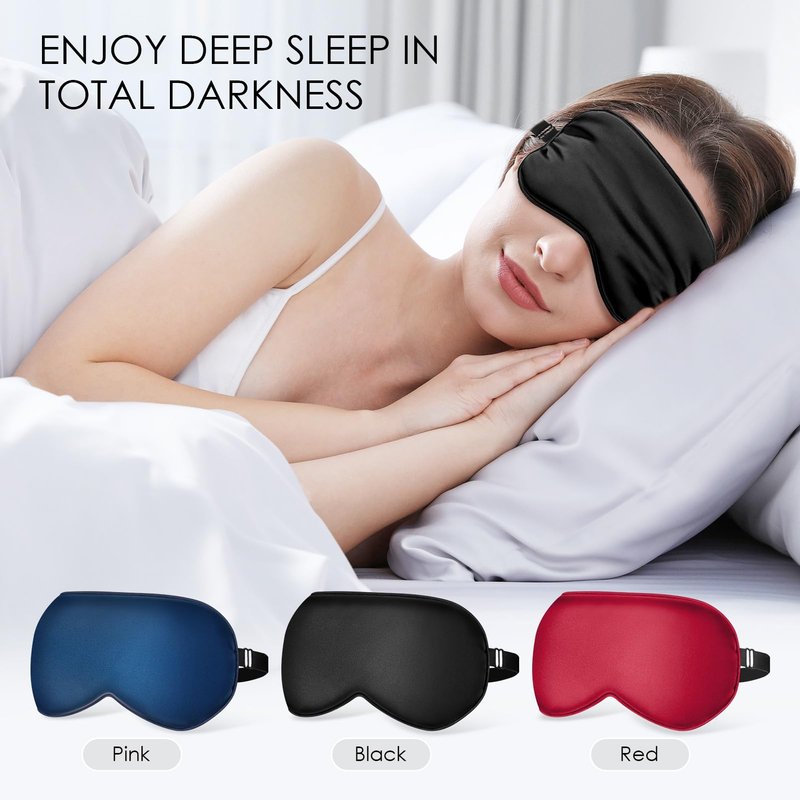 FlyCoco 3PCS Silk Eye Mask for Sleeping, Soft Comfortable Sleep Masks with Adjustable Strap, Light Blocking Night Masks, Blackout Eyes Covers for Aldult Women Men Travel Airplane, Blue+Black+Red