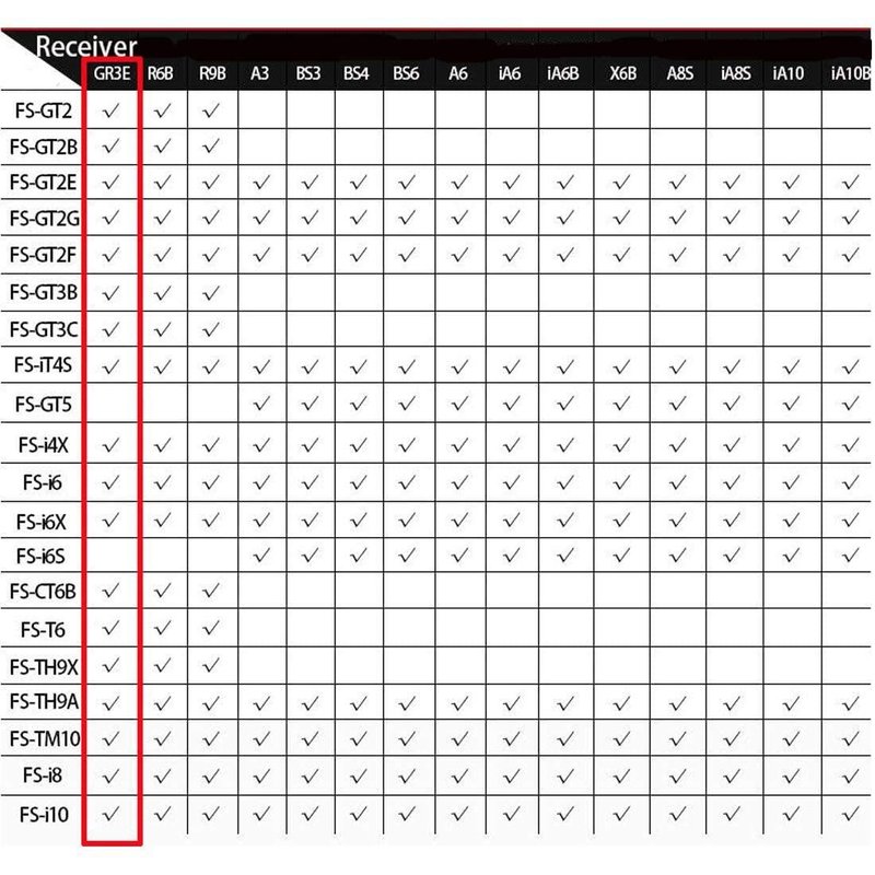 - Note: The factory communication protocol of GR3E receiver is AFHDS . Only when the transmitter communication protocol is AFHDS, it can link to the frequency. If the transmitter communication protocol is AFHDS 2A, you need to adjust the transmitter communication protocol to AFHDS according to the instructions in the manual. Only then can it be paired.Input voltage: 4.0-6.5V DC, this receiver is only suitable for part of the Flysky series Transmitter