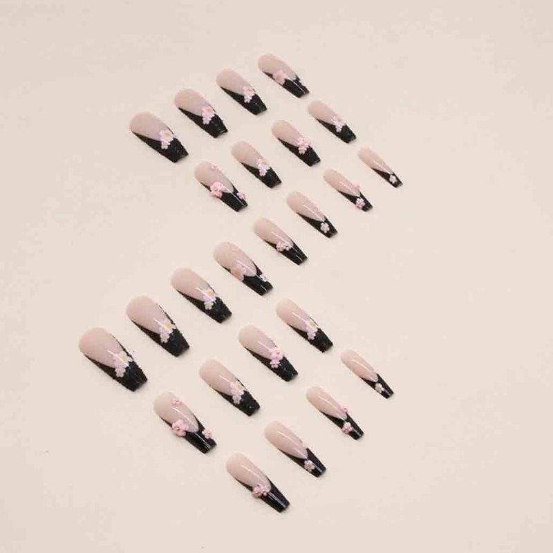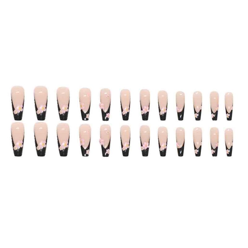 Foccna Black Press on Nails Long French 3D Flower Fake Nails Coffin Glossy False Nail Tips Artificial Nails Finger Manicure for Women and Girls,24pcs