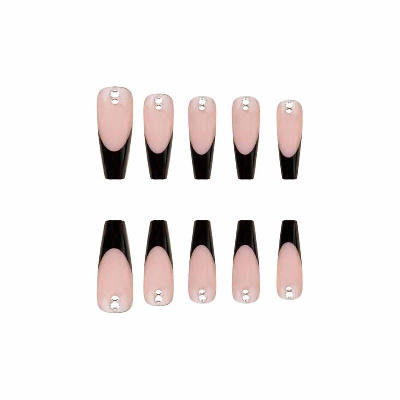 Foccna Long Press on Nails Black Coffin French Fake Nails Full Cover Nude Acrylic False Rhinestone Nails for Women and Girls 24PCS