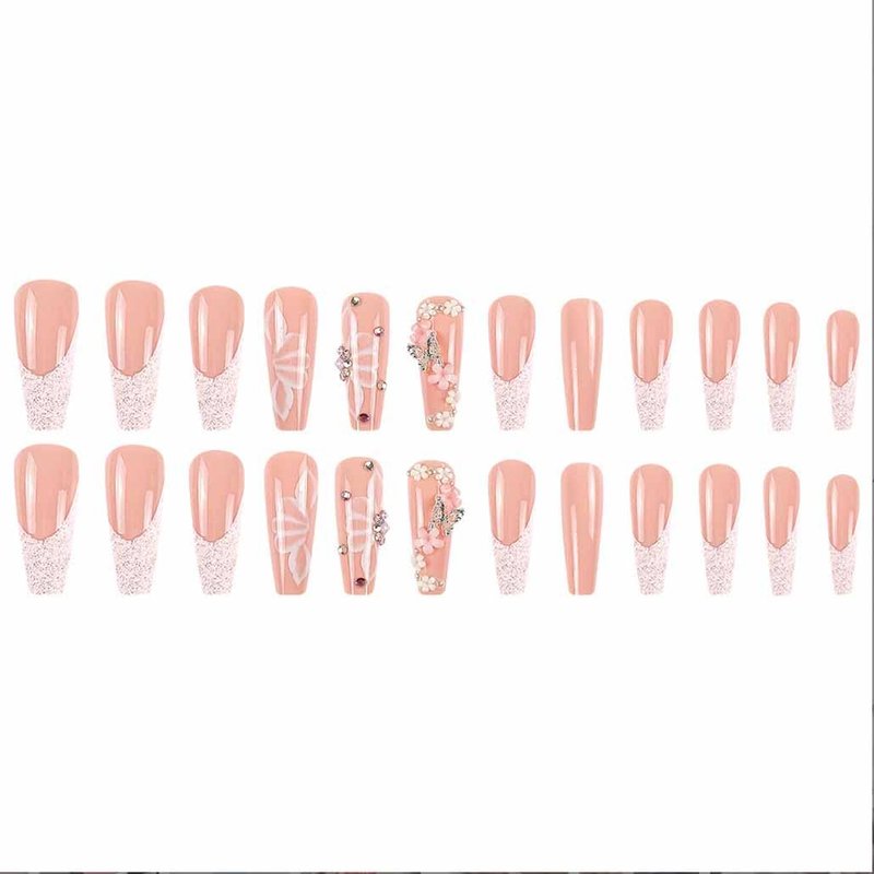 Foccna Pink French Press on Nails Long 3D Butterfly Fake Nails Coffin Bling Glossy Rhinestone False Nail Tips Artificial Nails Finger Manicure for Women and Girls,24pcs