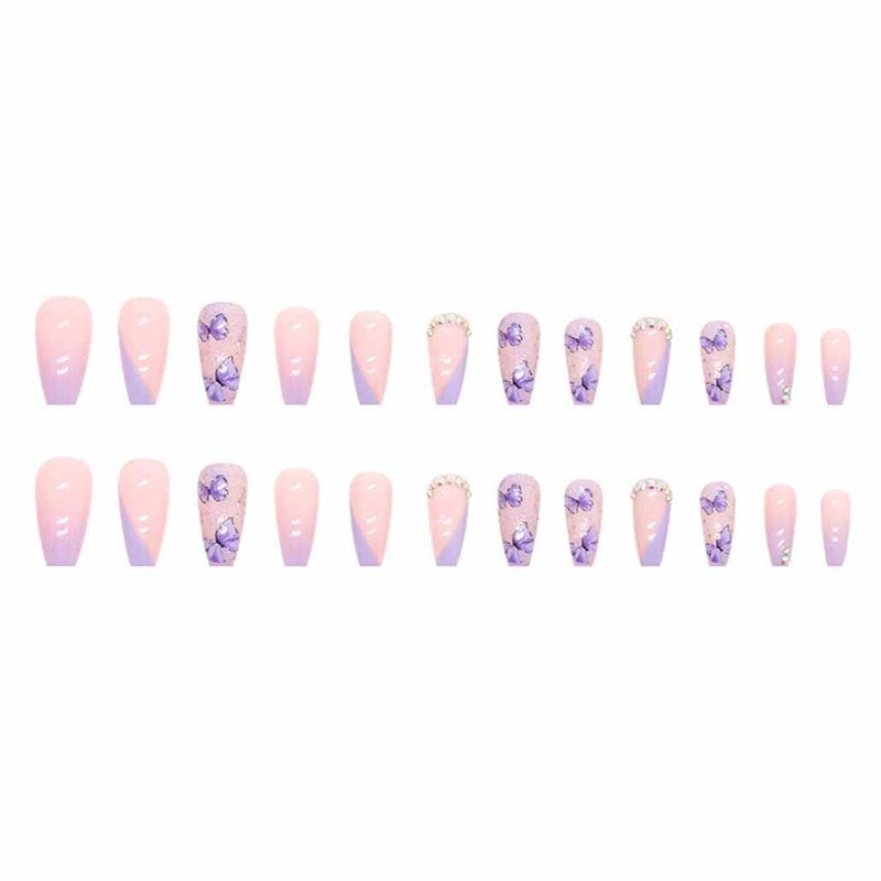 Foccna Purple Fake Nails Sequins Glitter Acrylic Butterfly Artificail Long Press on Rhinestone Nails, Purple Full Cover Fake Nails with Design Nail Tips for Women&Girls-24PCS