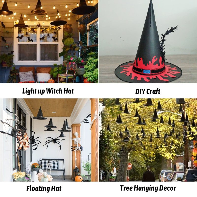 - Versatile Use:The black hats can be used as Halloween costume hat for witch and wizard,comfortable to wear;Plus,you can hang it up with included string on front door,porch,backyard,tree,ceiling and wherever you want for Halloween indoor outdoor decoration.