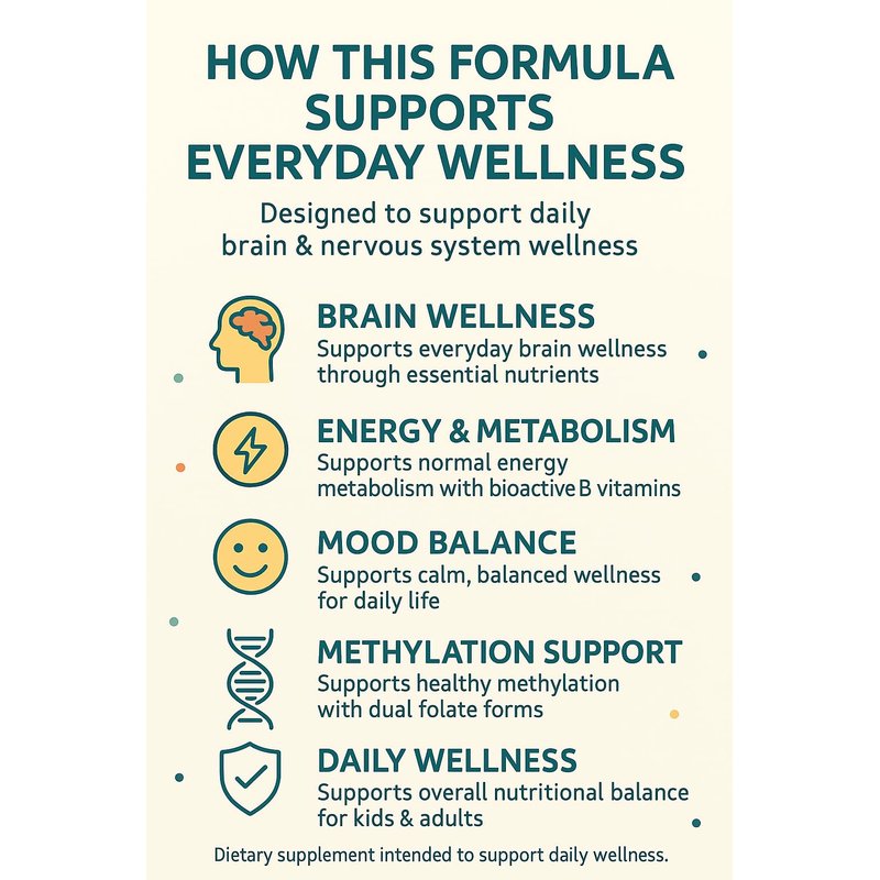 - 💛 Clean & Gentle Support for Growing Kids A thoughtful blend of bioactive folate (Folinic Acid + 5-MTHF) created for everyday wellness, focus, and healthy development.