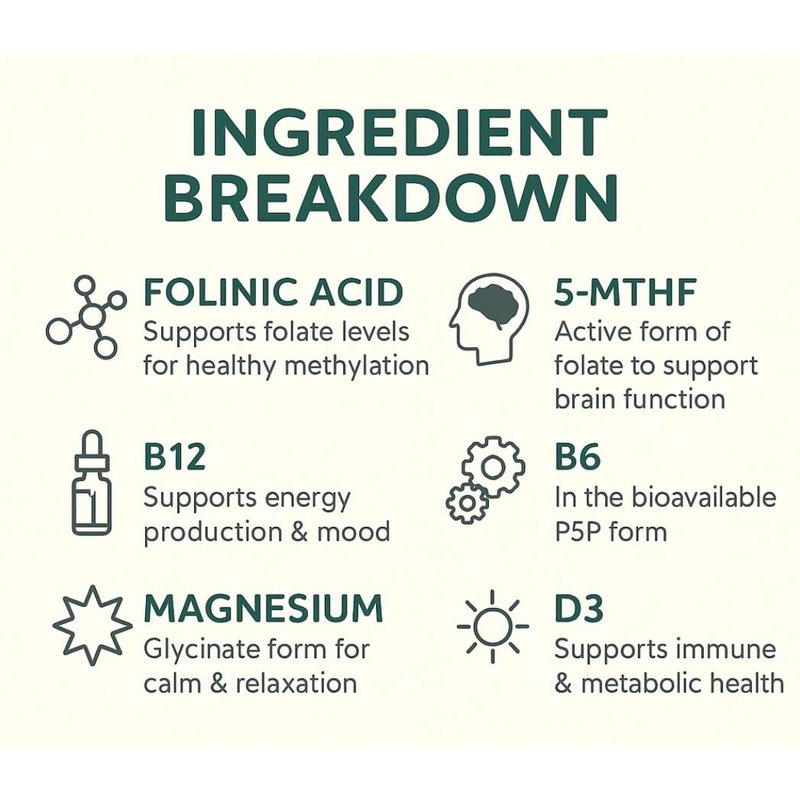 - ⭐ Complete Brain & Nervous System Blend Includes Methyl B12, Vitamin B6 (P5P), and Magnesium Glycinate — supporting cellular energy, calm mood, and healthy nervous system function.