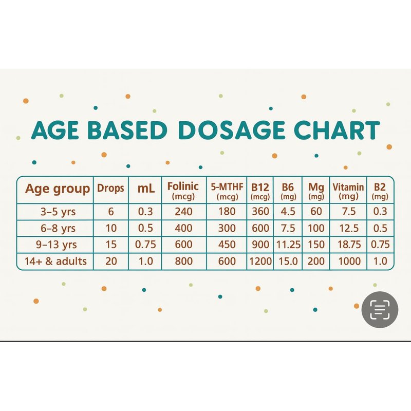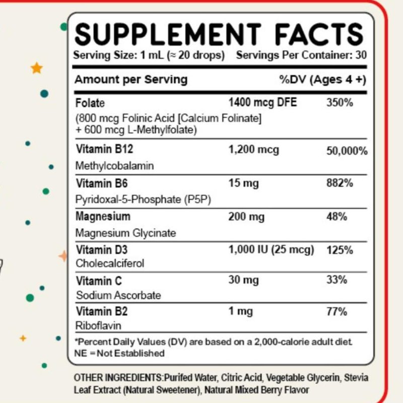 These Folinic Acid Drops provide a combination of bioactive folate Folinic acid + L- Methylfolate, B12 & B6 vitamins, magnesium, and essential nutrients designed to support everyday well-being for kids and adults. The liquid format makes it simple to incorporate into your family’s daily routine. Why Families Choose This Formula: ✔ Folinic Acid + L-Methylfolate — supports nutrient metabolism & overall wellness ✔ Methyl B12 & P5P B6 — help maintain comfortable energy and daily focus ✔ Magnesium Glycinate — helps support calm, balanced wellness ✔ Vitamin D3 & C — provide immune and antioxidant support Crafted for families seeking a simple, clean supplement to support their daily nutritional needs. 🌿 Created by a Mom for Her Child Born from a mother’s personal journey to find gentle, kid-friendly nutritional support when nothing on the market worked for her picky eater. 💛 Made for Sensitive Kids Thoughtfully formulated for families seeking clean, gentle ingredients without artificial fillers, dyes, or harsh additives. 🌱 Inspired by Real Research & Real Need Developed after extensive research into folate pathways and nutritional support for children needing extra help with wellness and development. 👩👦 Trusted by Parents Designed with real parents in mind — offering reassurance, simplicity, and a daily supplement kids actually enjoy taking.