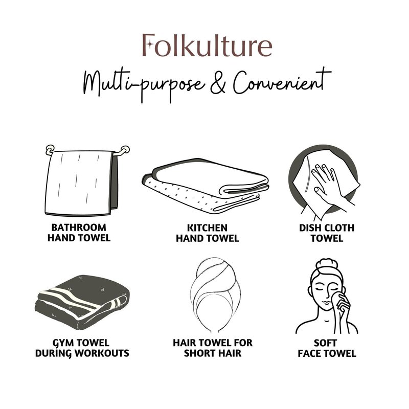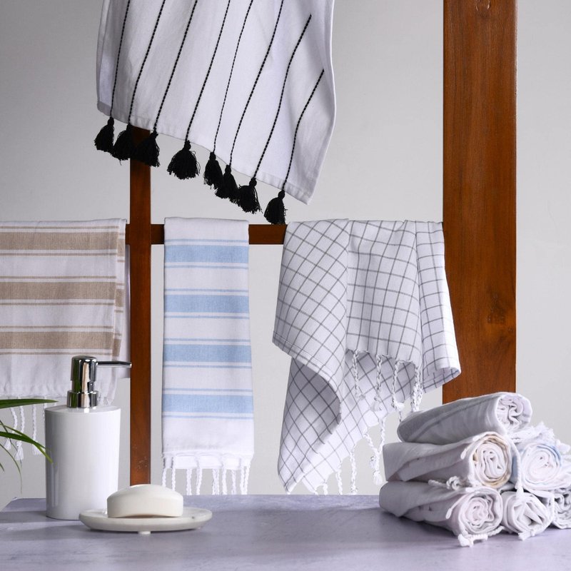Enhance the Look of Your Kitchen or Bathroom with Folkulture's boho hand towels for bathroom. A hand towel is an essential item you use almost every day, be it drying off dishes in the kitchen, wiping off your hands in the bathroom, or wiping away sweat after a tough day in the gym. That’s why we have created these gorgeous hand towels that make for modern farmhouse bathroom décor and offer an ideal balance of style, softness, absorbency, and luxuriousness that you won’t find in heavy cotton towels or linens. We use 100% recycled cotton which means our boho hand towels are not only softer and more absorbent they actually get softer to the touch after every wash cycle. Each luxury turkish hand towel or decorative towels for bathroom features durable tassels on the edges that give it a more vibrant, high-quality look and feel that really stands out and enhances your personal space. These hand towels for kitchen come in various designs that are simple and elegant with colors such as black, white, blue, and beige. Woven with premium organic cotton, these small hand towels add a decorative touch to your personal spaces and provide versatile use for washing or drying your face and hands, as a tea towel, gym and yoga, and more. Our bath towels feature a unique loomed, or tasseled, look that really enhances the look and feel of your room which makes them a great pairing for modern, farmhouse, or boho decor.