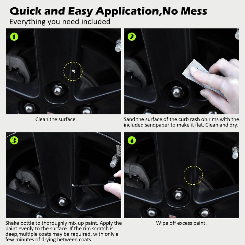 - Quick and Easy Application:You can do your own wheel paint repair work without the help of a professional - Sand the surface of the curb rash on rims with the included sandpaper to make it flat, shake the bottle, apply the paint evenly to the surface. You can repeat the application, the paint dries in minutes.