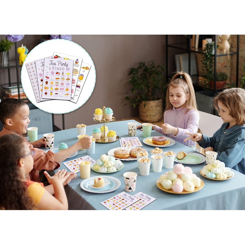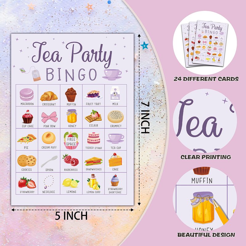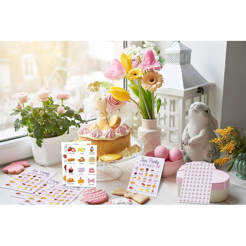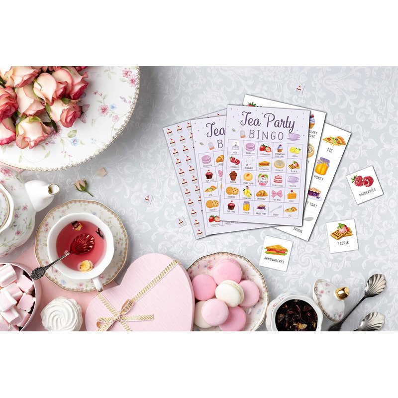 - 【ENJOY TEA PARTY BINGO CARDS】The Tea Party bingo game is an easy party activity to play and the cards are full of macaroon, eclair, cookies, cake, honey, croissant, milk and more, which will add warm ambience.