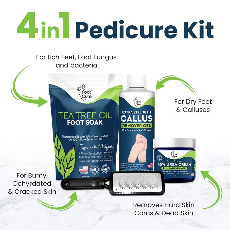 Foot Cure Foot Care/ Exfoliator & Callus Remover Pedicure Set – Includes Foot File for Dead Skin, Tea Tree Oil Foot Soak Salts, Urea Cream 40 Percent & Foot Callus Removal Gel – Made in USA