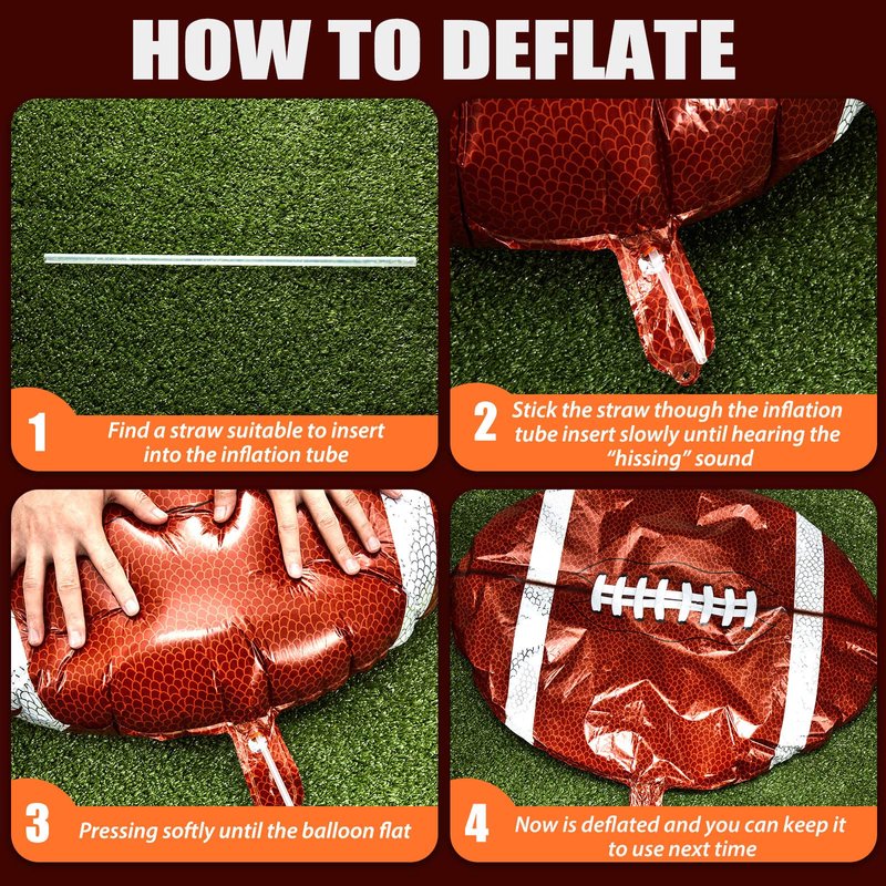 - Thoughtful design: the football aluminum film balloon can float and fly, the inflation port is automatically sealed, and the pump will automatically seal without leaking after inflating. What's more, it just need a straw which is inserted into the pump hole, then squeeze the balloon slowly, the gas can be shot from the punch hole, which is very convenient to use
