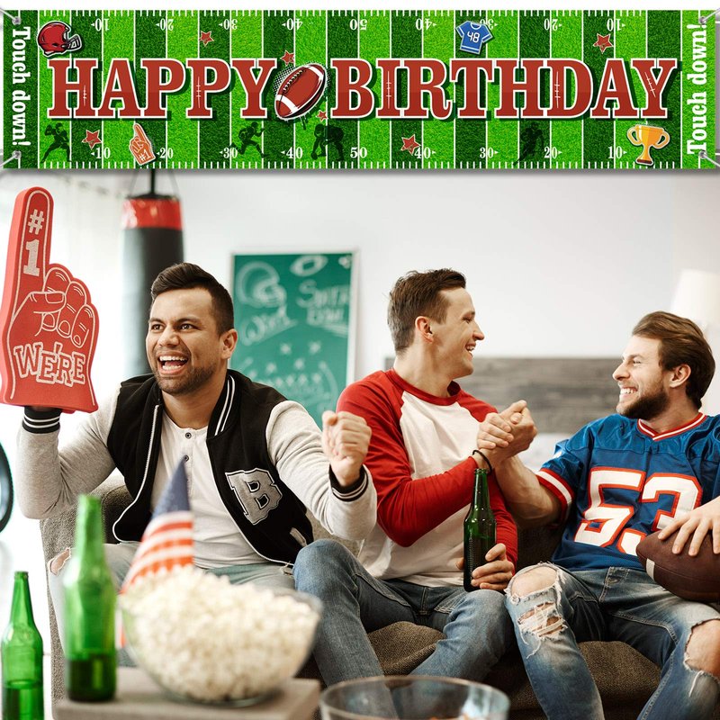 Football happy birthday banner football themed party decorations sunday game day sports fan supplies birthday party favorsEasy to assemble:Use a rope to go through the holes in the four corners of the banner cloth to hang it anywhere you want to decorate. Feature:Vibrant printing, seamless, durable, lightweight, easy to carry and non-fading.Wide application: Can be applied as a photo background, wall decor, room tapestry, curtain, birthday cake table banner, photo studio photography for football theme party, birthday party, festivals, etc..Specification:Material: thick polyester fabricsSize: Banner: 70.8 x 15.7 inches/ 180 x 40 cmString: 13.12 feet/ 4 meterPackage includes:1 x Banner1 x White stringNote:The rope included in the package has a risk of entanglement, please keep away from children.Please allow slight deviation due to manual measurement.