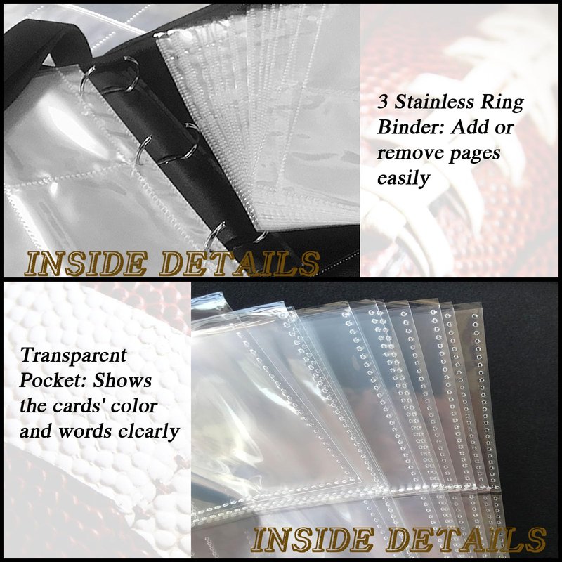 - 【Football Card Binder 400 Pockets】Each football card binder has 50 pages, each page has a double-sided card slot,holds up to 400 cards. Fits any standard, 3-hole pages or paper. It is refillable/expandable, It means that you can arbitrarily increase or reduce the number of internal Pages.