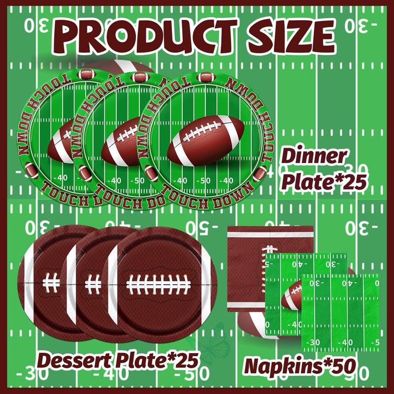 - 【FOOTBALL PARTY SUPPLIES】You will receive 100pcs football party decorations tableware set includes 25pcs 9inch touchdown plates,25pcs 7inch football party plates,50pcs football napkins ( two styles),each can serve 25 guests.This football party decor plate and napkin are printed with the font "TOUCH DOWN", with rugby and football field patterns as the theme,vivid and eye-catching,which will add surprise to you,your family and friends