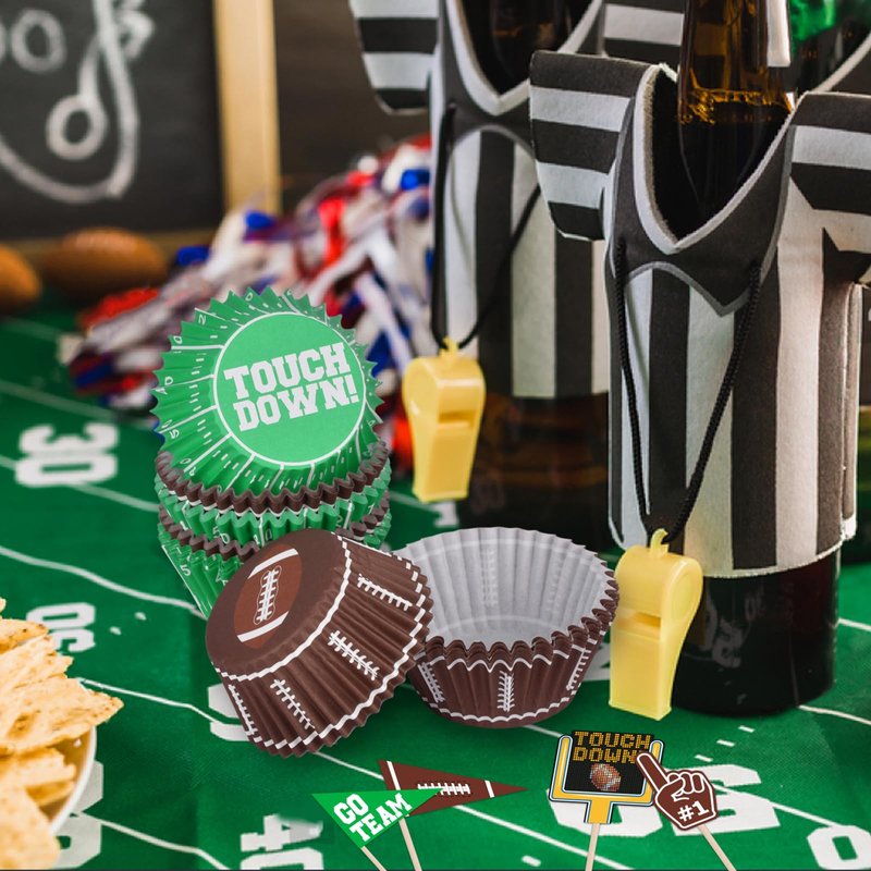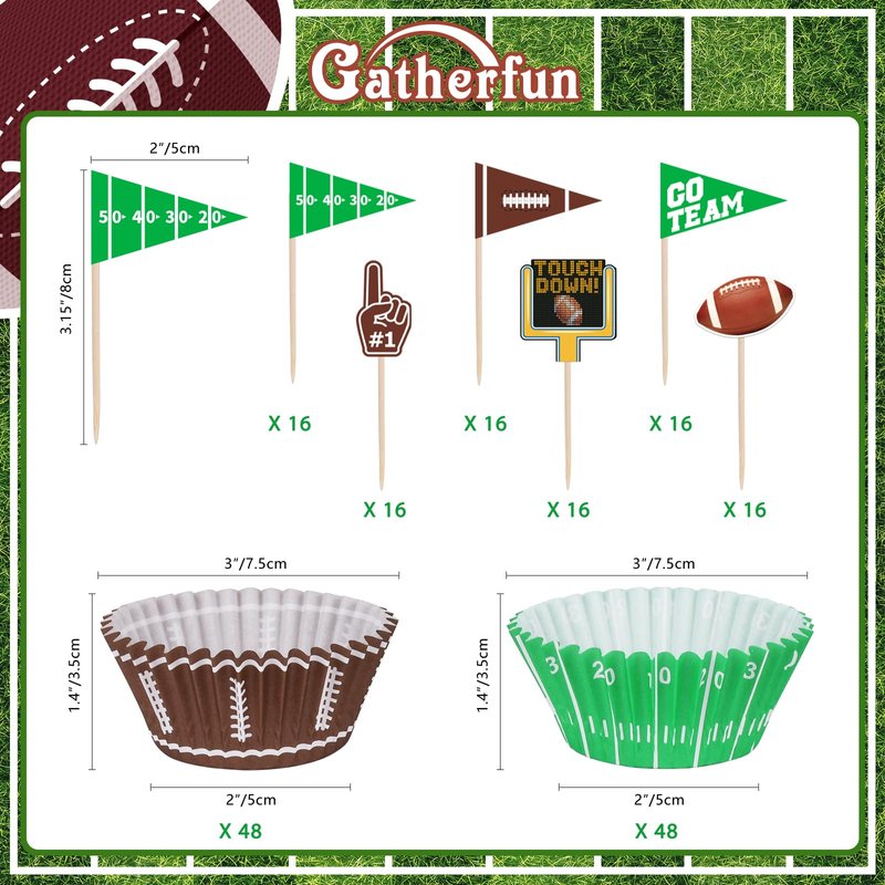 - Football theme birthday party supplies pack contains, 96pcs CUPCAKE TOPPERS,96pcs Cupcake Liners,featuring two diverse styles, our cupcake wrappers cater to all your baking, decorating, and serving needs, bringing convenience and creativity to your kitchen.