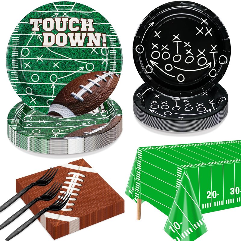 - 【Perfect Football Formation Tactics Design】On the basis of football, we chose the classical football-themed element to design “Touch Down” tableware, and tablecloth. These exciting football decorations are sure to be a hit will all your guests, kids who are interested in sports themes.