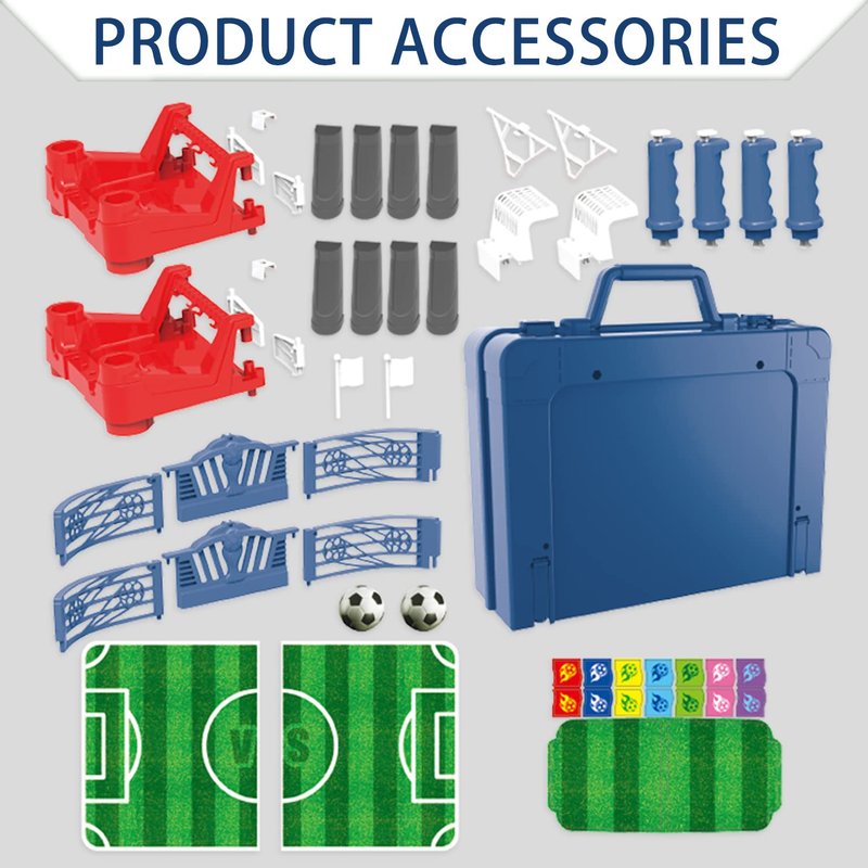- Accessories: The size of this table football game is: 22" x10" x8" / 55 x 26 x 21 cm; The set contains 1 football fields, 2 balls of soccers, 4 control handles, 2 goal nets, and 2 fence used to secure the football fields, it's also very easy to instal