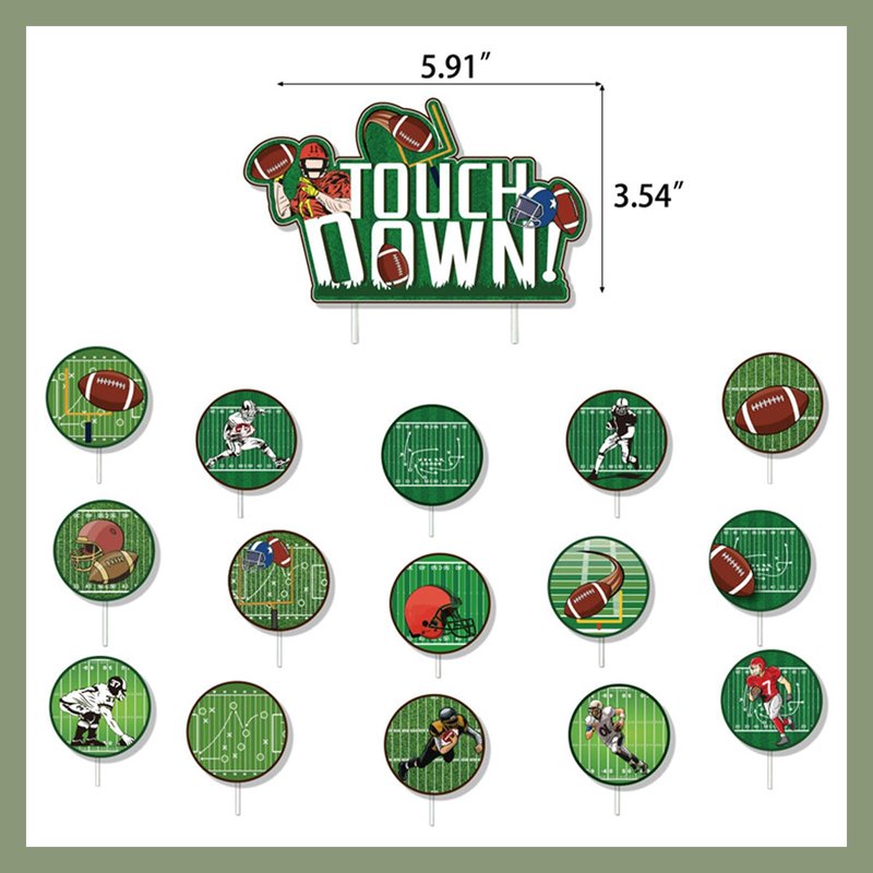 The football decor party set includes: 【Happy Birthday letters banners】,【16 pcs Cupcake toppers】【1x large touch down cake toppers】.