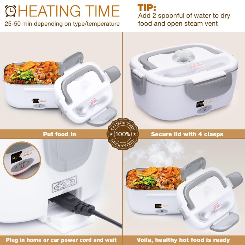- WARM HEALTHY MEAL ANYWHERE: No microwave required. Always on the GO and tired of cold or fast food? Now simply plug in and heat up your food with the FORABEST Improved 60W fast heating system electric heating lunch box at home/office or in car/truck using the 110V/12V power cables. Enjoy your warm & healthier homemade food.