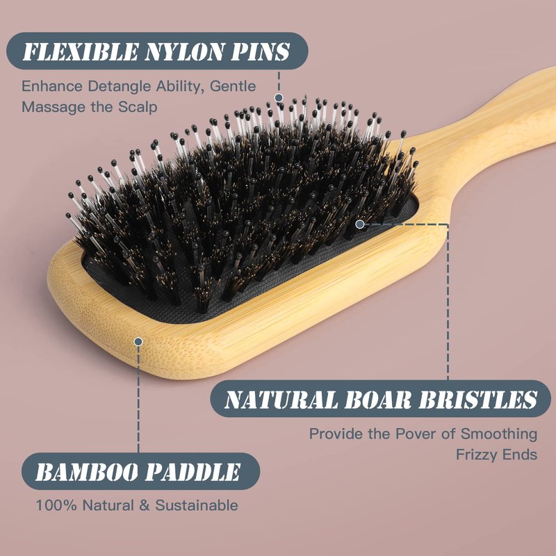 - âăEXQUISITE CRAFTăThe mix ratio of boar bristles to ball-tips nylon pins ensures the perfect hardness of the hair brush, allows it to go through different thickness of hair easily while each hair enjoys the care of genuine boar bristles. Good material provide enough strength to last long.