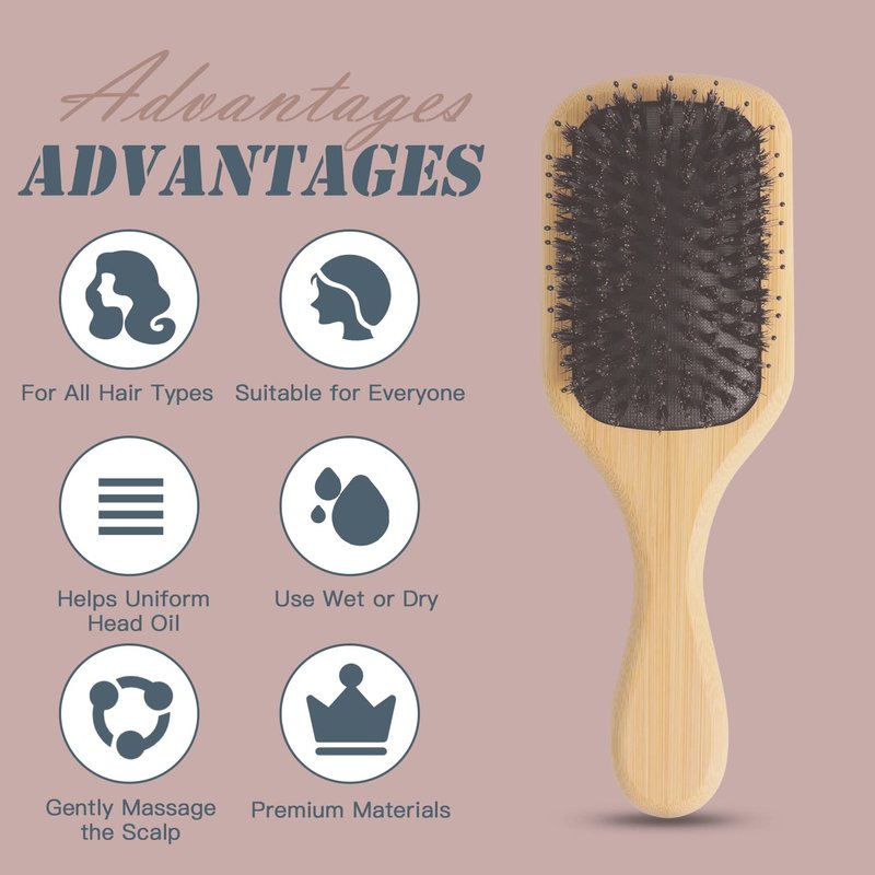 - đăREFUSE TO DRY & TANGLED HAIRăUsing our boar bristle hair brush to gently brush through any tangled hair helps redistribute the oil on the scalp, following the hair follicles to the ends of the hair. Heals dry, brittle hair while removing excess oil, smoothing hair and adding shine.