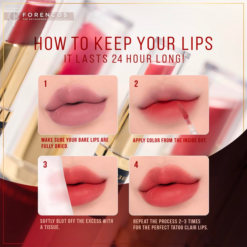 Experience the ultimate lip color with Forencos Tattoo Clair Velvet Lip Stain/Tint. Our innovative formula ensures that your lips stay vibrant and beautiful all day long. The velvet lip tint not only provides a weightless and non-sticky finish but also offers exceptional longevity, making it perfect for any occasion. Whether you're heading to a special event or just going about your daily routine, our lip stain will keep your lips looking flawless and fresh.The long-lasting wear of our velvet lip stain means you can enjoy beautifully tinted lips without the need for frequent touch-ups. Applying Forencos Tattoo Clair Velvet Lip Stain is easy. Follow our simple application tips to achieve a stunning tattoo effect on your lips. First, ensure your lips are clean and dry. Apply a thin layer of the lip stain, starting from the center of your lips and working your way outwards. Allow the tint to set for a few minutes and blof off the excess with a tissue as many as you want . Then enjoy the incredible, long-lasting color.Make your day perfect with Forencos Tattoo Velvet lip and experience the difference of a lip color that combines vibrant pigmentation with unparalleled staying power.