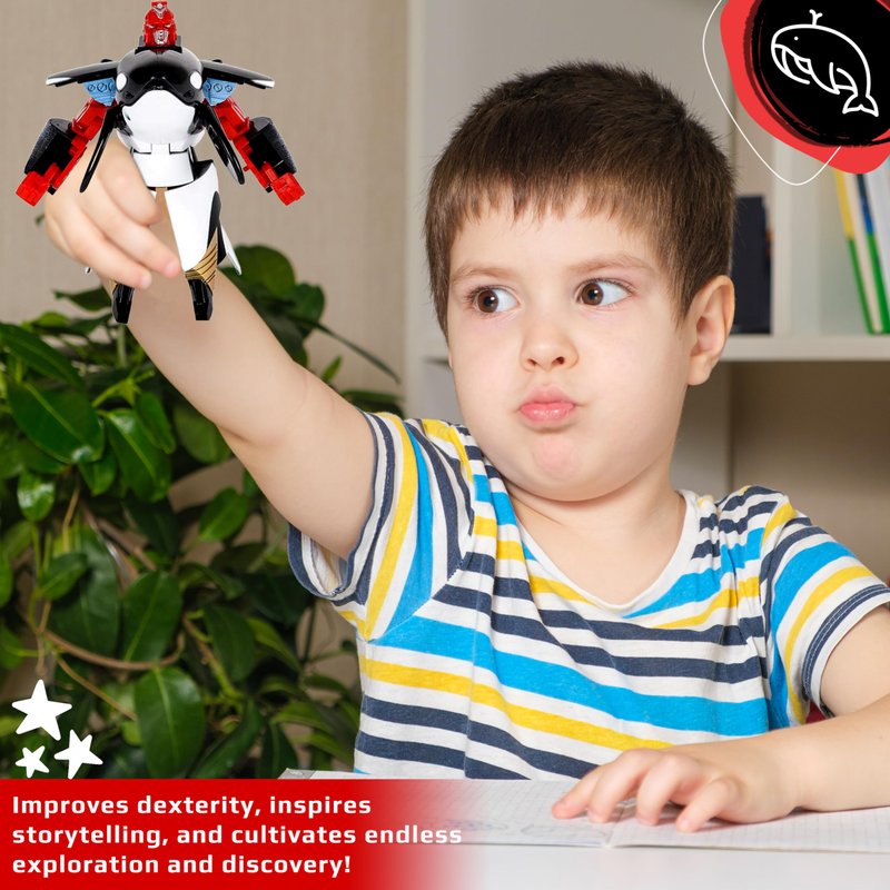 - TRANSFORMING ROBOT ORCA – Watch your child’s eyes widen in amazement as they discover the hidden secrets this Orca animal toy holds. By moving its pieces around, it transforms into a fully articulate and powerful robot toy.