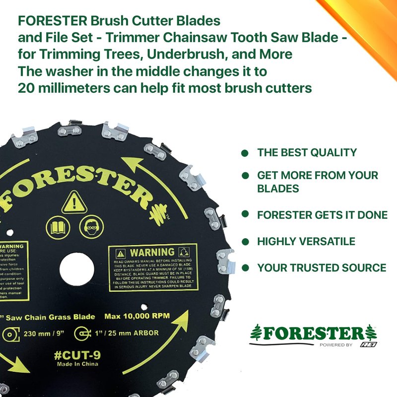 FORESTER Brush Cutter Blades and File Set - Trimmer Chainsaw Tooth Saw Blade - for Trimming Trees, Cutting String, Underbrush, and More - 20 Tooth 9" Circular Brush Blade with 3/16" File