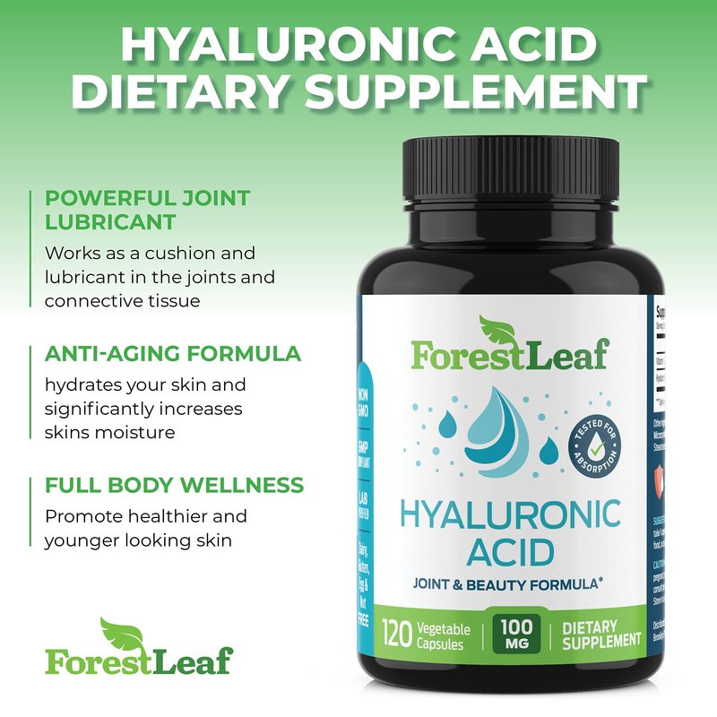 ForestLeaf - Hyaluronic Acid Supplements - 120 Vegetable Capsules - 100mg Dietary Hyaluronic Acid + 50mg Vitamin C Joint & Anti Aging Beauty Formula - Supports Skin Hydration, Joints, Bones & Hair