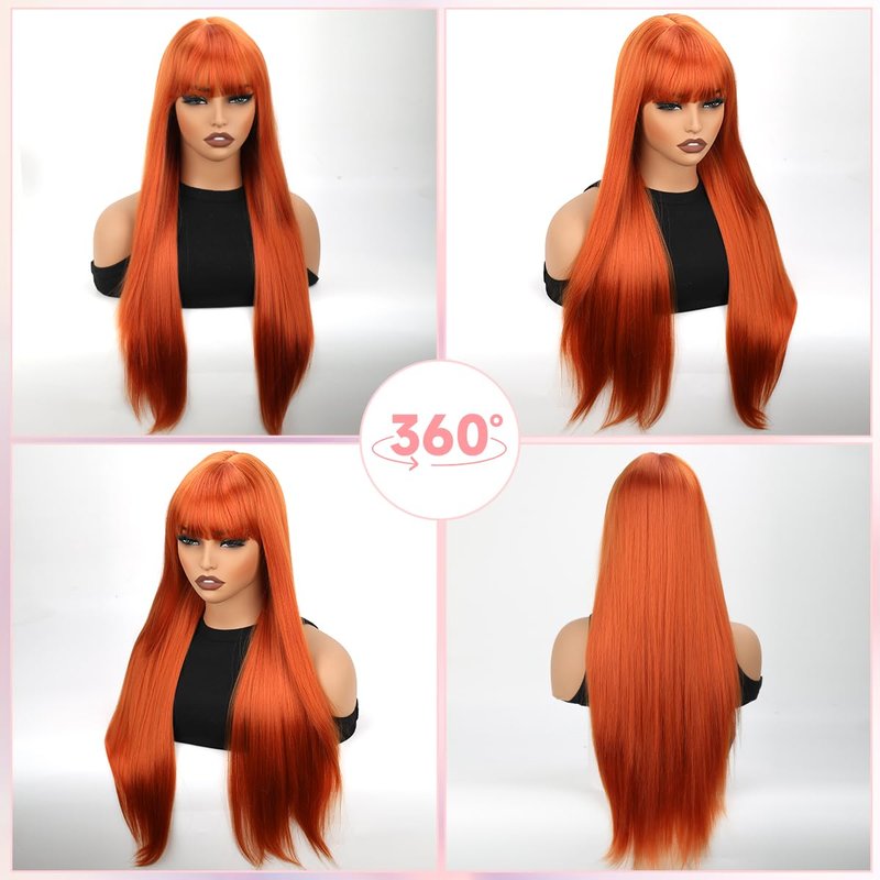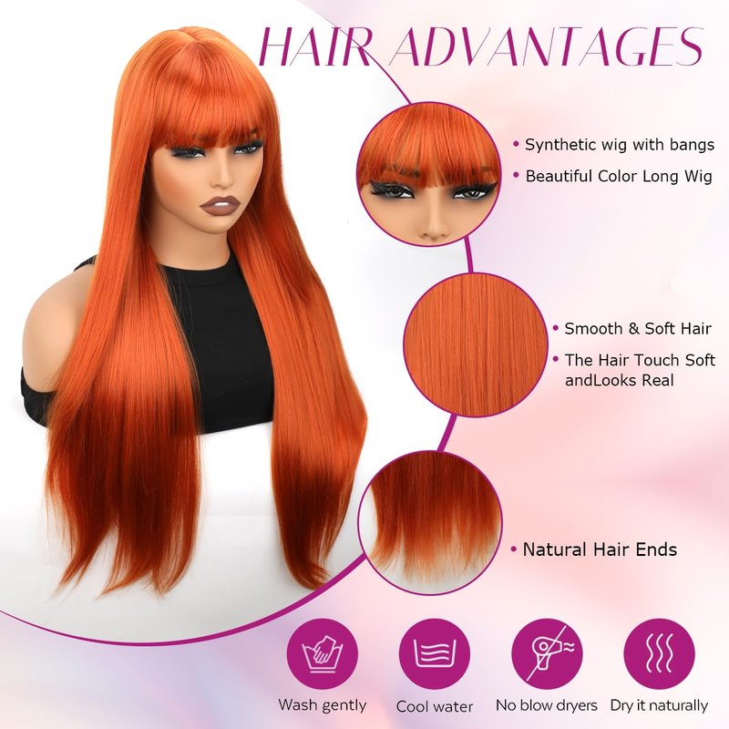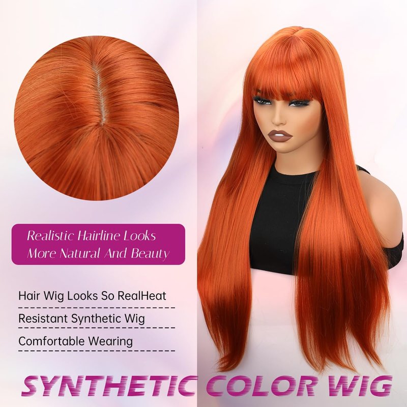 forfeels Long Orange Wig For Women 28 Inches Long Orange Ginger Synthetic Wigs Natural Looking Orange Synthetic Hair Wigs Straight Synthetic Wig With Bangs