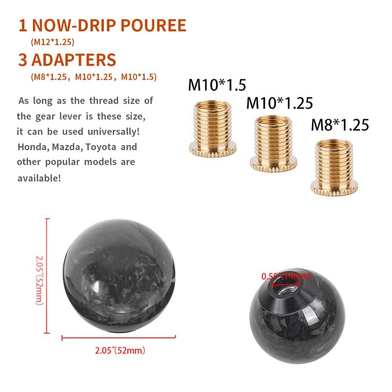 - Package: 1 x Carbon Fiber Shift Knob, 3 x Threading Copper Adapters ( M 8 x 1.25, M 10 x 1.5, M 10 x 1.25 )