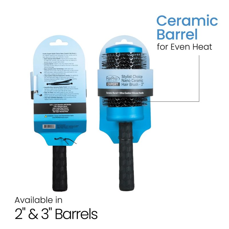 ForPro Professional Collection Expert Stylist Choice Nano Ceramic Hair Brush, 100% Natural Anion Bristle, Silicone Ergonomic Handle, 3" Ceramic Round Brush, Matte Blue