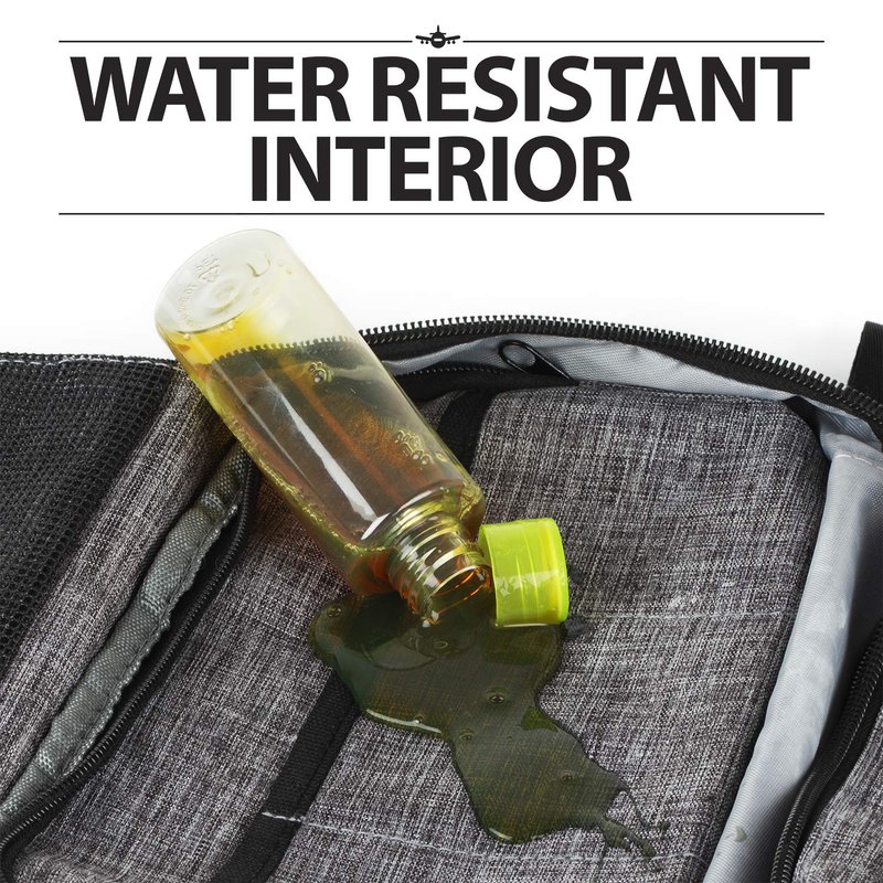 - [SPLASH RESISTANT OUTSIDE, WATERPROOF INSIDE] Don’t worry about getting the outside of your toiletry organizer wet, the splash resistant fabric will stay dry. Any accidental spills on the inside won’t leak out into your luggage due to the waterproof interior.