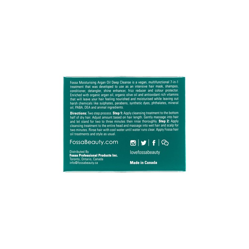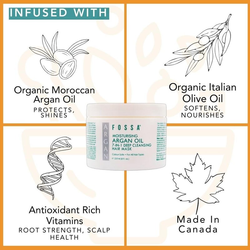 - HAIR REPAIR FOR ALL TYPES: Fossa's Moisturising Argan Oil 7-in-1 Deep Cleansing Hair Mask provides healing treatment for all hair types and is colour safe. The beneficial fatty acids of the organic argan oil can help increase your hair's elasticity. The organic olive oil boosts moisture, strengthens roots, and can help reduce damage and split ends. The hair mask provides a deep cleaning and intensive conditioning without tangles, frizz, or colour fade.
