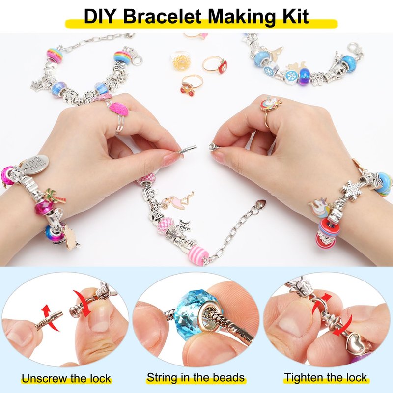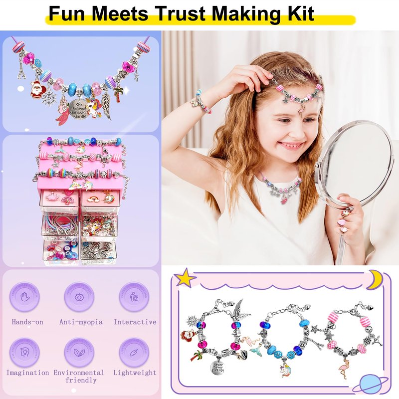 - ARTS AND CRAFTS FOR KIDS: Great charm bracelet kit,simple to use,No Tool,No Glue,No Mess. 4 5 6 year old girl toys,just unscrew the clasp to easily complete the bracelet. Jewelry box for girls of bracelets,necklaces,and rings are all ADJUSTABLE in size. Shiny beaded bracelets are suitable for teen girl gifts trendy stuff. Dress up & pretend play charms craft supplies for little girl toys age 4-5. Unlock your girl's creativity with this jewelry making supplies arts and crafts for kids ages 8-12