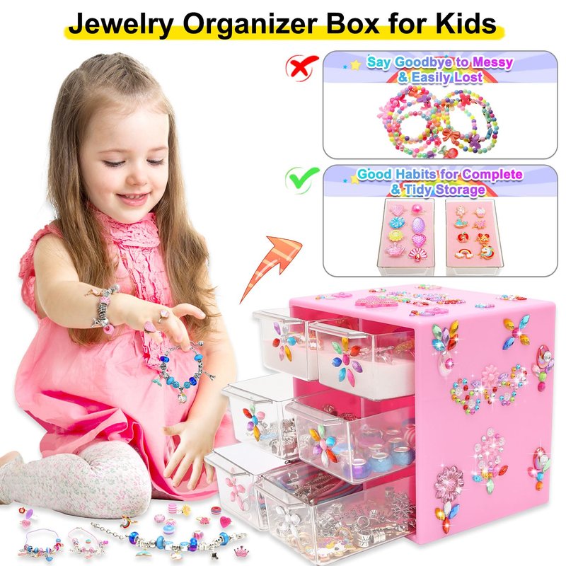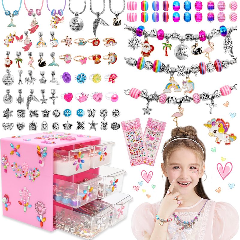 - GIRL TOYS MEET ALL YOUR NEEDS: Crafts for kids ages 4-8 is packed with all beads for bracelets! Lovely girls jewelry box comes with 6 small storage drawers. Charm bracelet making kit include:20x colorful beads,20x pendant charms for Bracelets,16x kids rings,20x metal beads,3x snake bracelet,3x necklace chains,2x crystal stickers. Perfect bracelet kit girls toys age 6-8,kids toys art supplies for 7 8 9 year old girl birthday gift ideas. Design your style with this beads for jewelry making