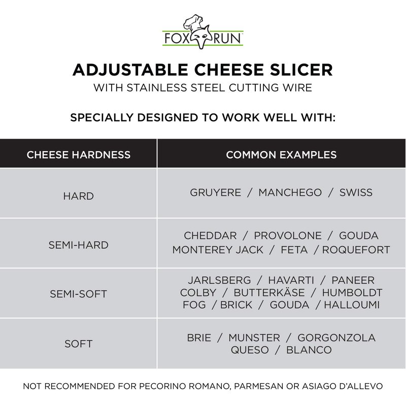 - EASILY HANDLES CHEESE BLOCKS UP TO 3. 5” WIDE: Adjust the slicer to give you wafer thin slices or nice, chunky slices up to ¼” thick. No matter the thickness, the Fox Run Brands Slicer handles the cheese with ease