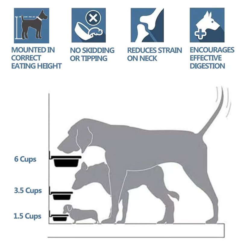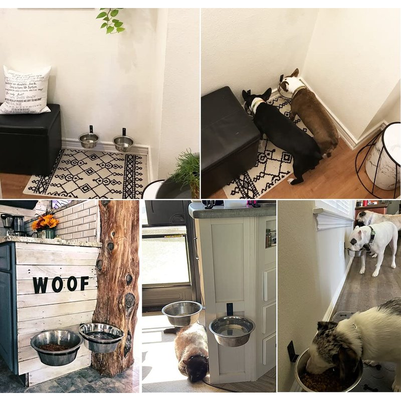 - Wall Mounted Pet Bowls, Bowls and Holders installed up off the floor, Can customize height for each dog, match for the comfortable eating height and divide aggressive eaters