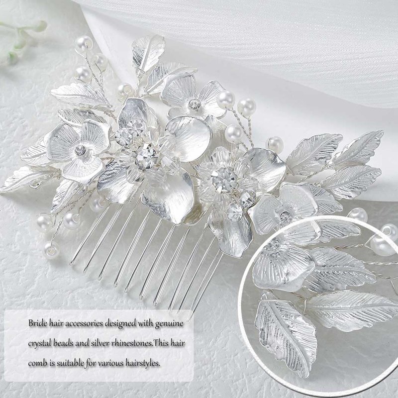 Foyte Crystal Bride Wedding Hair Comb Silver Flower Bridal Headpieces Leaf Hair Pieces Pearl Bridesmaid Side Combs Hair Accessories for Women (silver pearl)