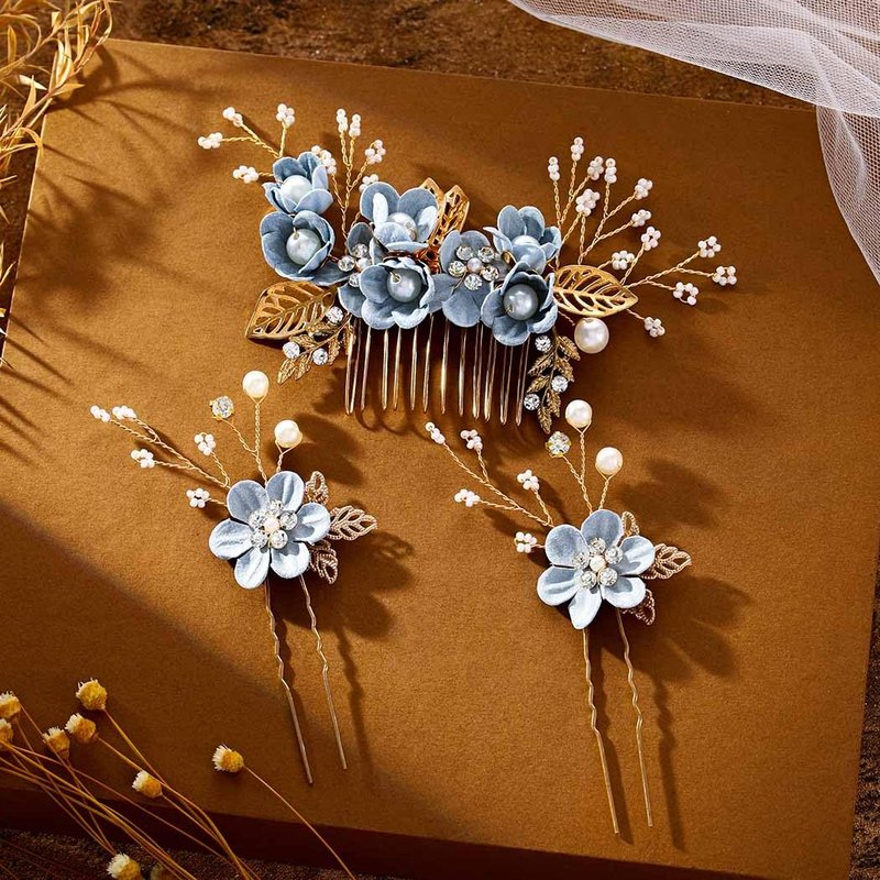 - Crystal bride wedding headpieces set comes with one comb and two hair pins.It is made of alloy wire.Blue flower hairpieces are sustained, comfortable, and lightweight