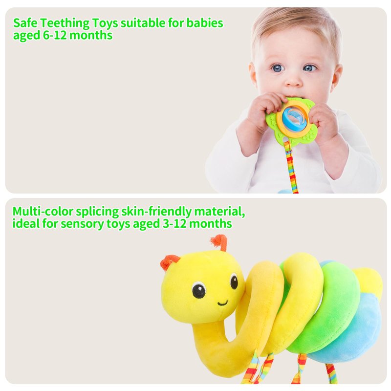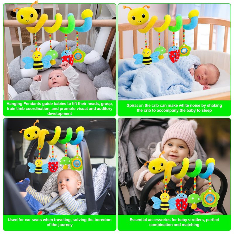 - Safe and Soft Material: This 2-in-1 baby hanging spiral activity toy is seamlessly molded and tightly connected. It does not have small detachable parts, allowing babies to chew safely. Containing colorful beads, babies can see through the transparent shell. When shaken, it makes a baby-like creaking sound, all of which contribute to its popularity as a baby toy. Implemented a function to one replace multiple toys