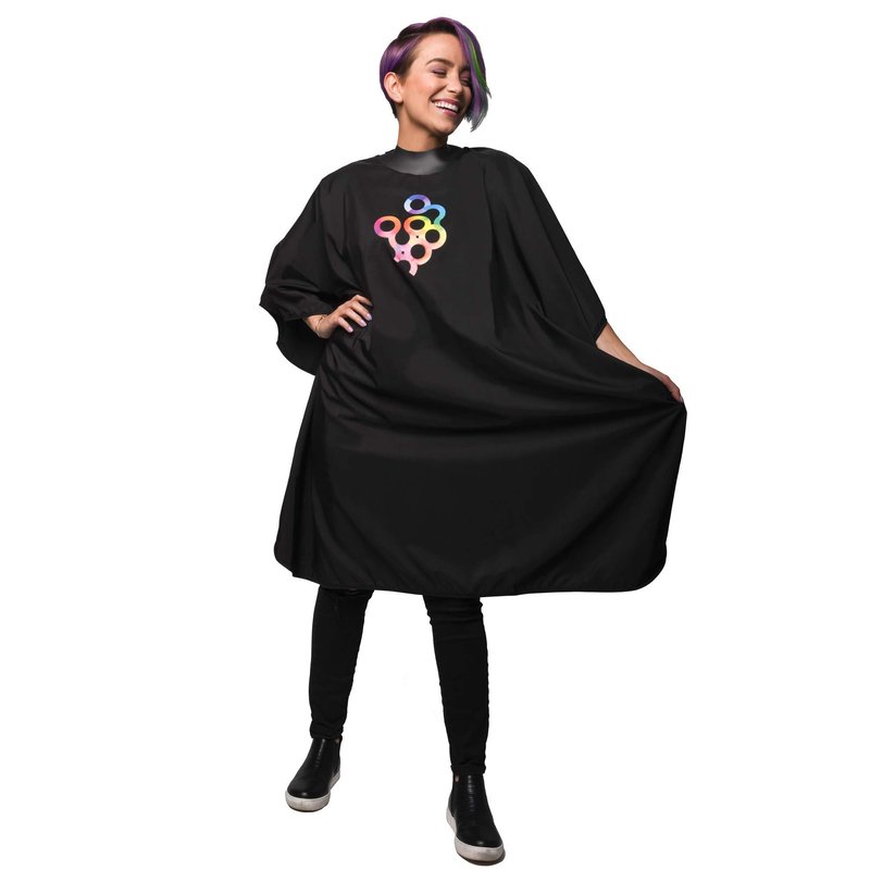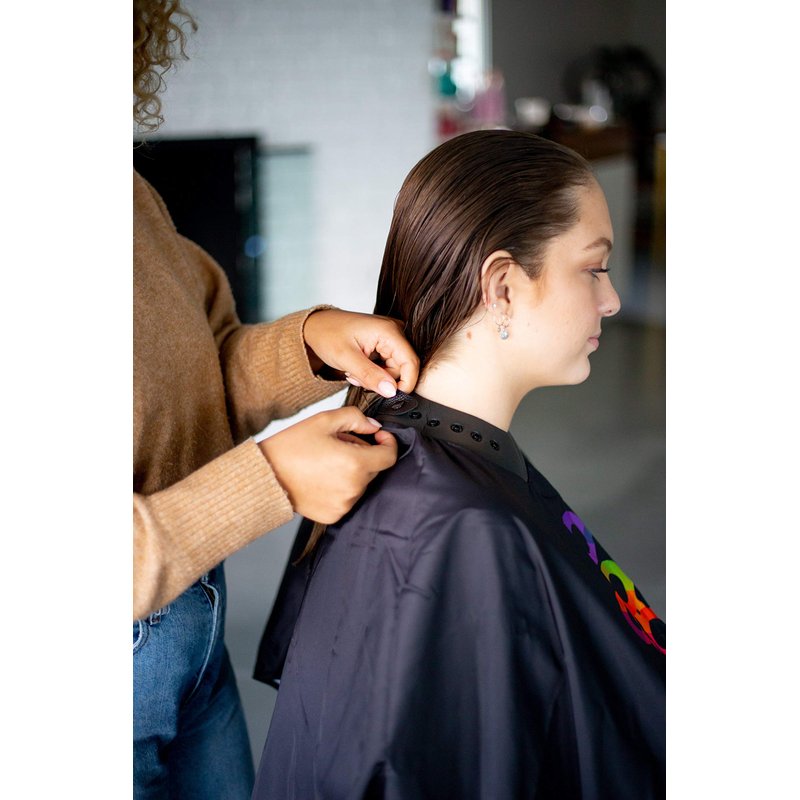 Smooth Surface that allows hair to slide off cape Exceptional polyester material that is breathable for client Water Resistant Snap neckline for easy use on all clients Machine washable/Dryer Safe