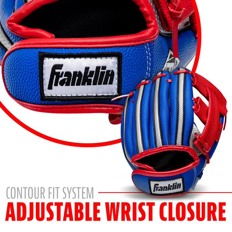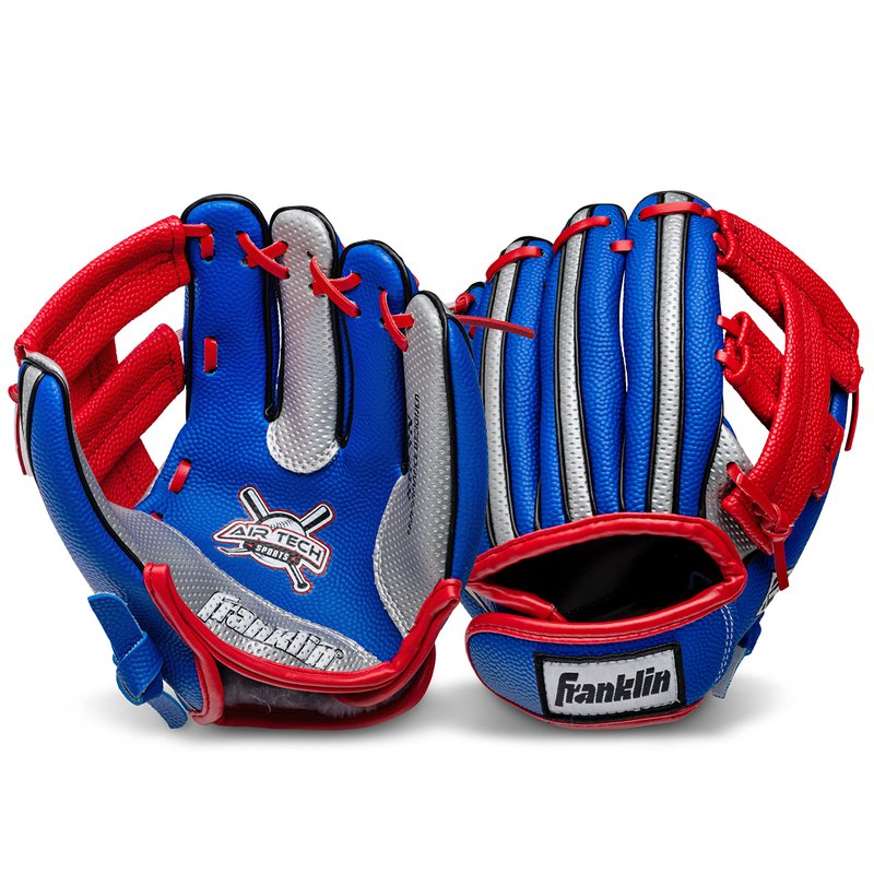 Franklin Sports Kids Baseball Glove + Ball Set - Air Tech Youth Teeball Glove - Boys + Girls Children's Glove + Ball - Right Hand Throw - Blue, Red and Silver, 9"