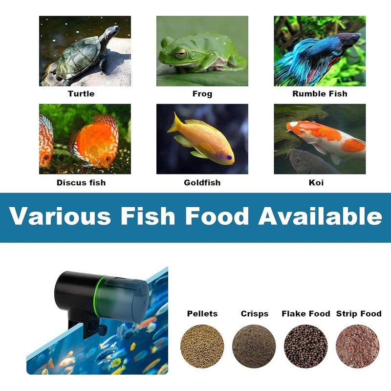 - 【Moisture-Proof Design】: The electric feeder adopts moisture-proof design to ensure the freshness of food. No blockage will occur. The feeder is suitable for fish food such as strips, powder , granules, and flakes.