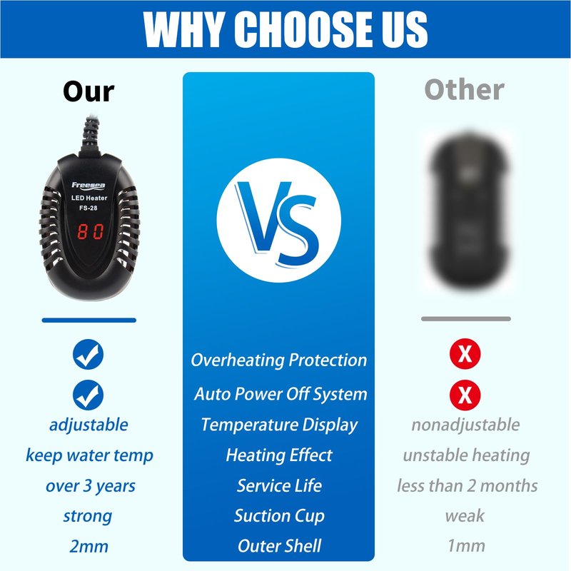 - LED Temperature Display: Digital led temperature display shows the real-time temperature and error code on the screen. When the mini aquarium heater is heating, there indicator light above the digit is on red