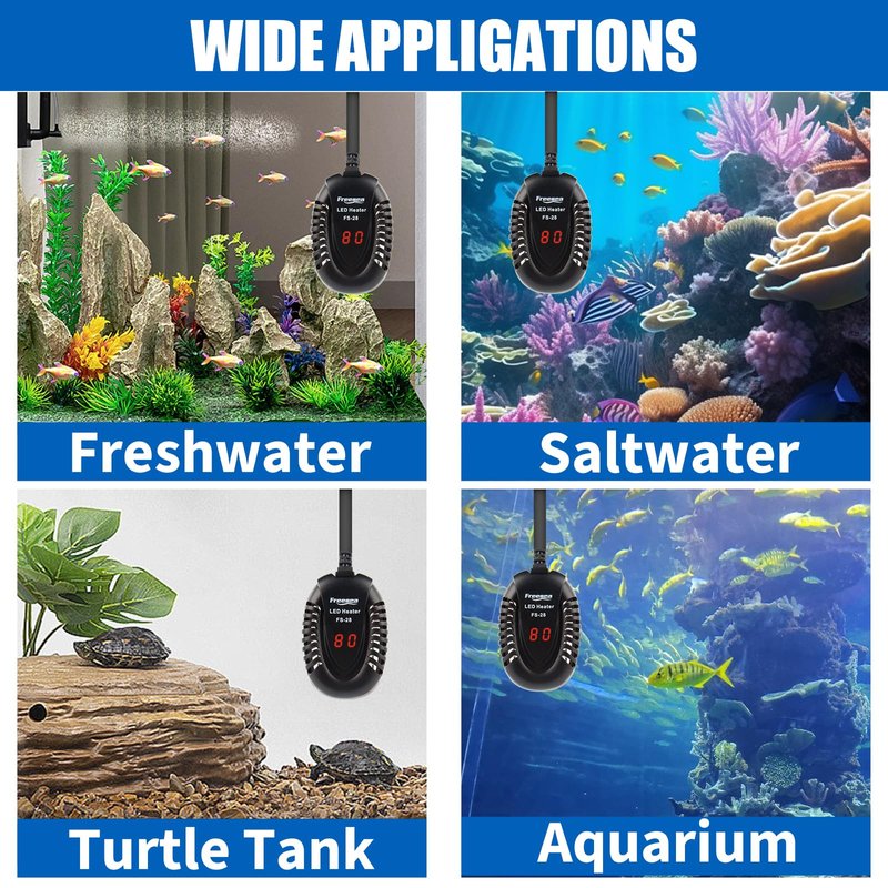 - FREESEA Aquarium Heater: 50w betta fish heater, voltage: 110~120V, is suitable for use in 1-10 gal betta fish turtle tanks and aquariums. The power cord is 5ft, long enough for indoor use