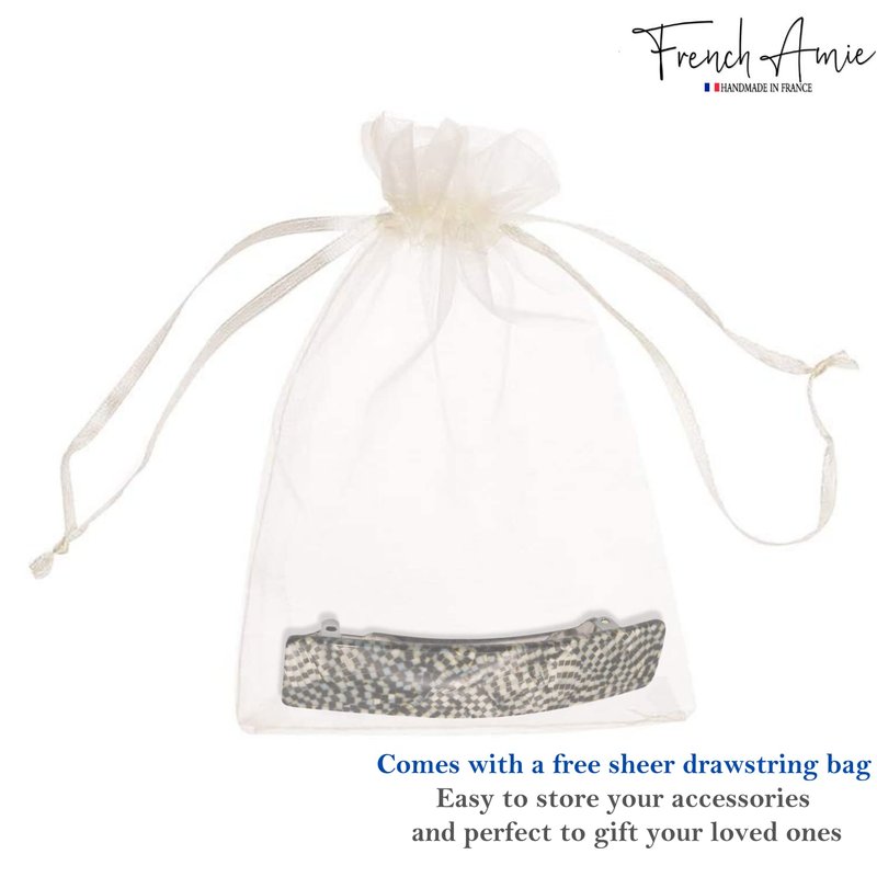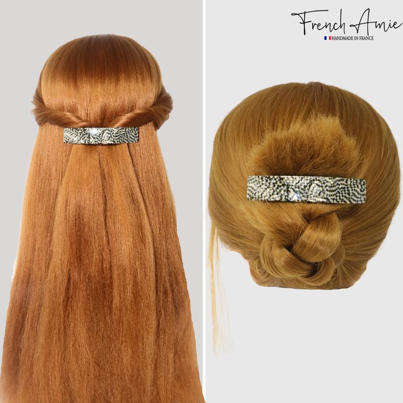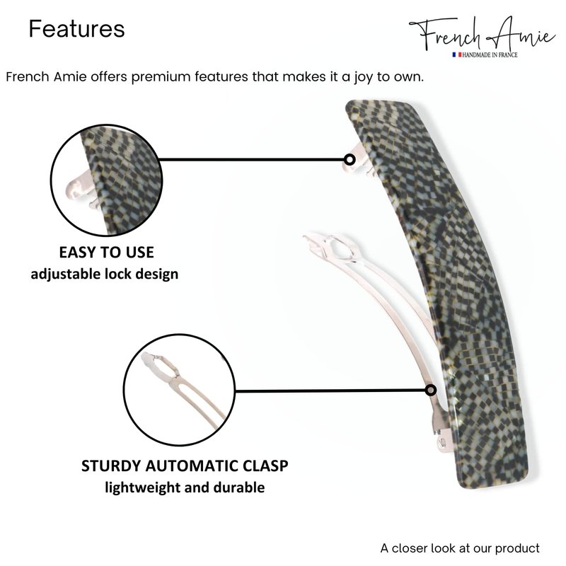 French Amie Hair Accessories are original from France This Barrette has automatic closures you will never buy the lesser made cheap barrettes that rip your hair out when you remove them from your ponytail, up sweep, side sweep or Hair Do. This automatic barrette is fantastic for medium to thick hair.These are hard to find in stores at this competitive price. This is the premium end of the market product.We only use the best material for our products which are both strong and durable. Why compromise your choice. We hope you like our selection.